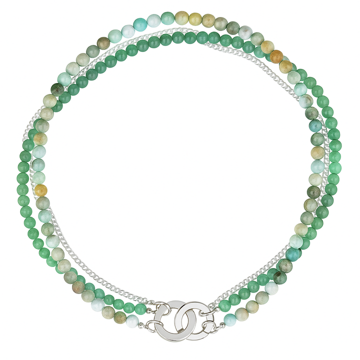 The smooth green layer is made with Aventurine beads, believed to heal traumas and soothe suffering. The multi-coloured strand includes smooth, round Golden Amazonite beads, believed to calm emotions, worry and fear. The third layer features our Thick Curb Chain made in sterling silver with a shiny finish; a stunning contrast that offers shine, depth and gorgeous personality. Wear 1, 2 or all 3 layers, and play around with how you use the clips because there are countless ways to style it. Check out our Eclipse Necklace (same design with black and cream stones) for styling inspiration.