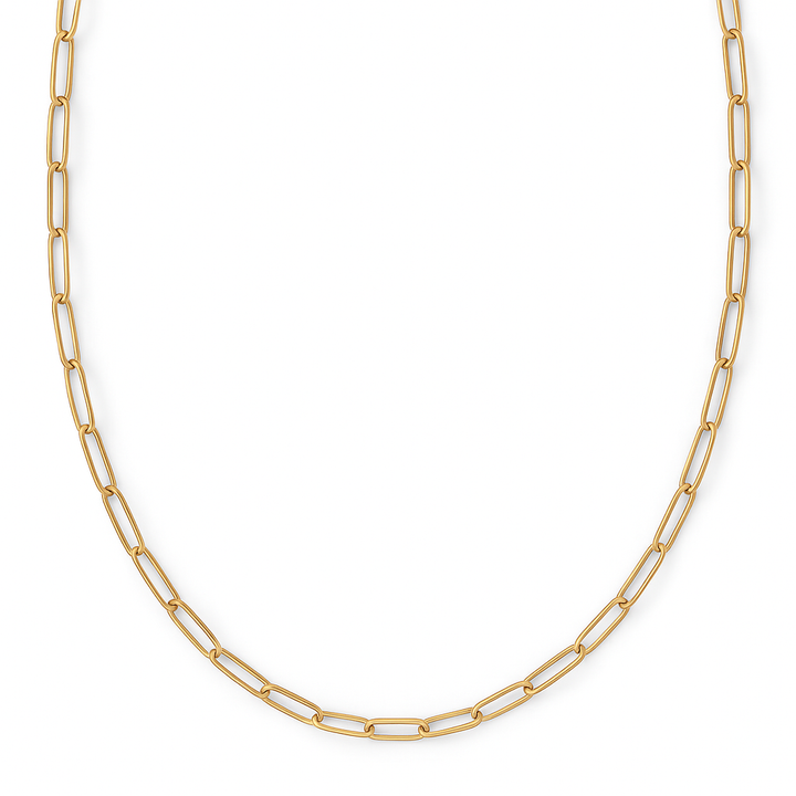 Our Gold Paperclip Chain is the chain trend you're craving. It sits rounded and we love it worn anywhere between choker length and 36" long. In fact, the links are large enough to attach the lobster clasp at any length, so style it at the perfect length for you and let the extra length hang down at the front to add a bit of edginess.
