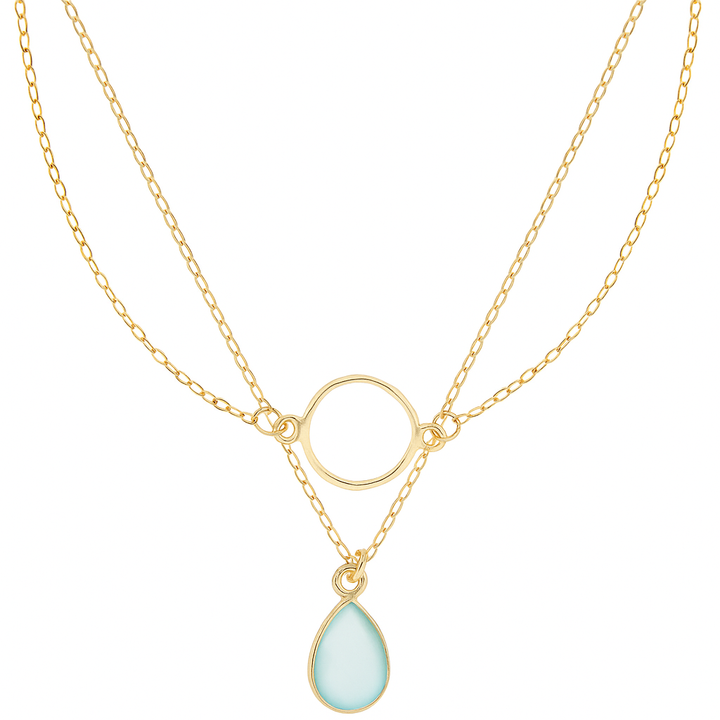 The longer layer includes a chalcedony stone, the colour of the ocean when it's reflecting sunshine (yes, let's channel more of that). Available on an 18" or 20" Yellow Gold Cable Chain that fastens with a spring clasp.