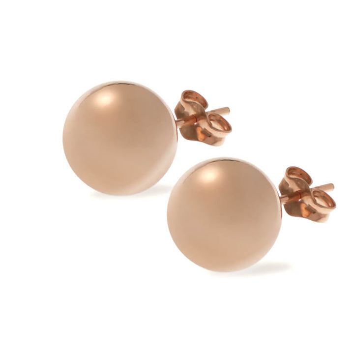 Want to warm up your ears? These Large Rose Gold Ball Stud Earrings have a shiny finish. They are made of sterling silver and plated in 14K rose gold and fasten with a butterfly clasp.