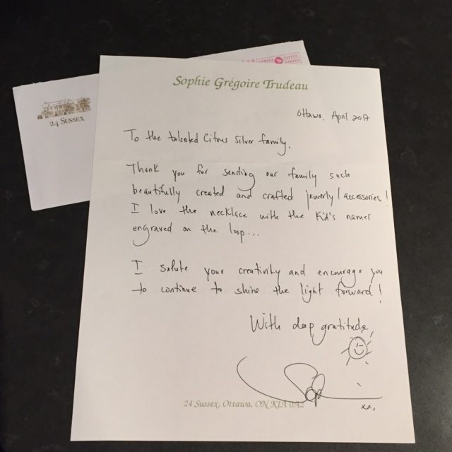 Named after Sophie Grégoire Trudeau; wife of Canadian Prime Minster Justin Trudeau. We sent her this design, hand stamped with the names of their 3 children so Sophie could always be close to them even when they are apart. We're delighted with the personal handwritten thank you letter that she mailed to us; see thumbnail image.